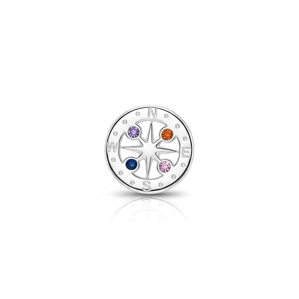 O Separador Rosa dos Ventos – Prata 925 traz um design inspirado no símbolo clássico de navegação, com aberturas que formam a rosa dos ventos e pontos cardeais em relevo ao redor da peça. Detalhes cravejados coloridos completam o visual, trazendo brilho e um toque moderno ao acessório.